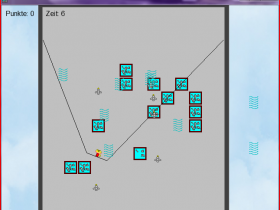 Spielablauf: Die Spielfigur befindet sich auf einer kleinen Plattform, die an zwei Seilen festgemacht ist.