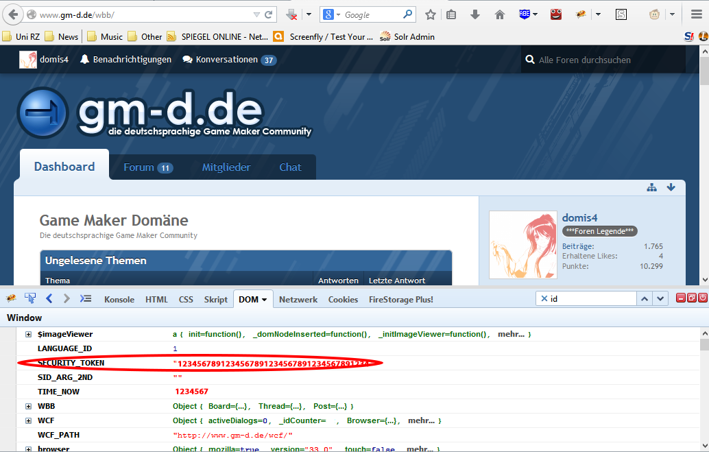 Nun ist es möglich, dass deine Session hier irgendwo im DOM liegt. Als einfacher Wert, wie unsere "value" Variable. Mittels dem Firefox Plugin "Firebug" ist es dir übrigens möglich den DOM relativ schick anzusehen. Im Falle von gm-d (das ja auch auf Woltlab basiert) gibt es Beispielsweise ein "Securetoken" im DOM. Es ist gut möglich, dass dieser, deiner gehashten ID entspricht. Ich habe mal einen Screenshot präpariert (ist natürlich nicht mein Token, sondern eine einfache Zahlenfolge)