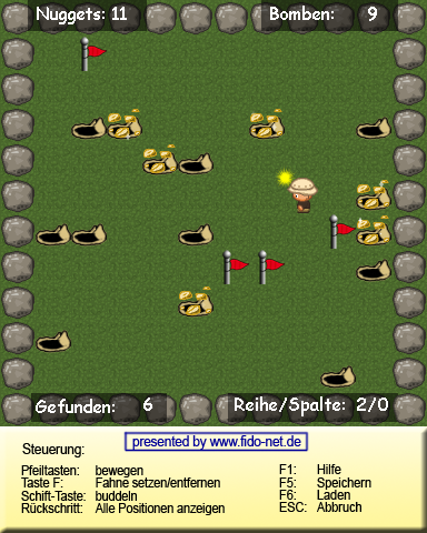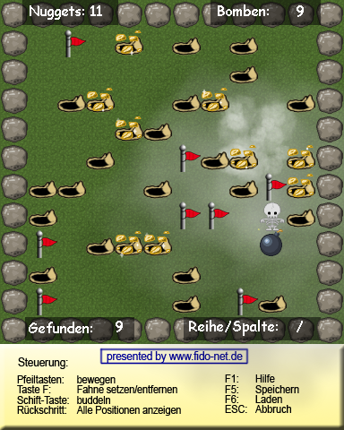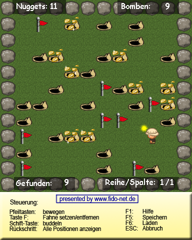 • Ja, garnicht schlecht, nur sollte sich die Rücktaste nur einmal verwenden lassen, denn sonst kann man wenn man eh noch keine Punkte hat, sich alle Nuggetpositionen ansehen, merken, Fähnchen setzen - gefahrlos buddeln... Das heißt ich finde man sollte die Taste nur eimal verwenden können oder bei verwendung werden alle Fähnchen gelöscht, aber ansonsten ein schönes Spiel!
