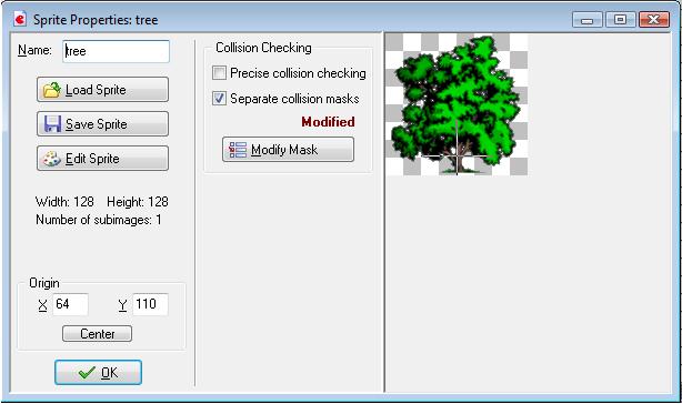 • Stelle die Origin des Spieler Sprites tiefer, sie sollte sich in deiner Mask befinden, und zwar ziemlich mittig (beim Baum am besten auch).