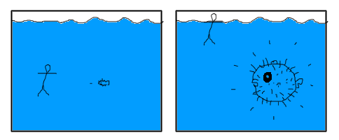 • Er kann sich aufblasen und viele schiesst Stacheln
