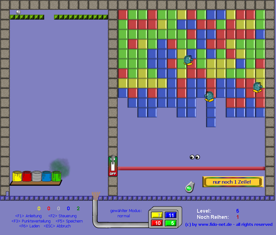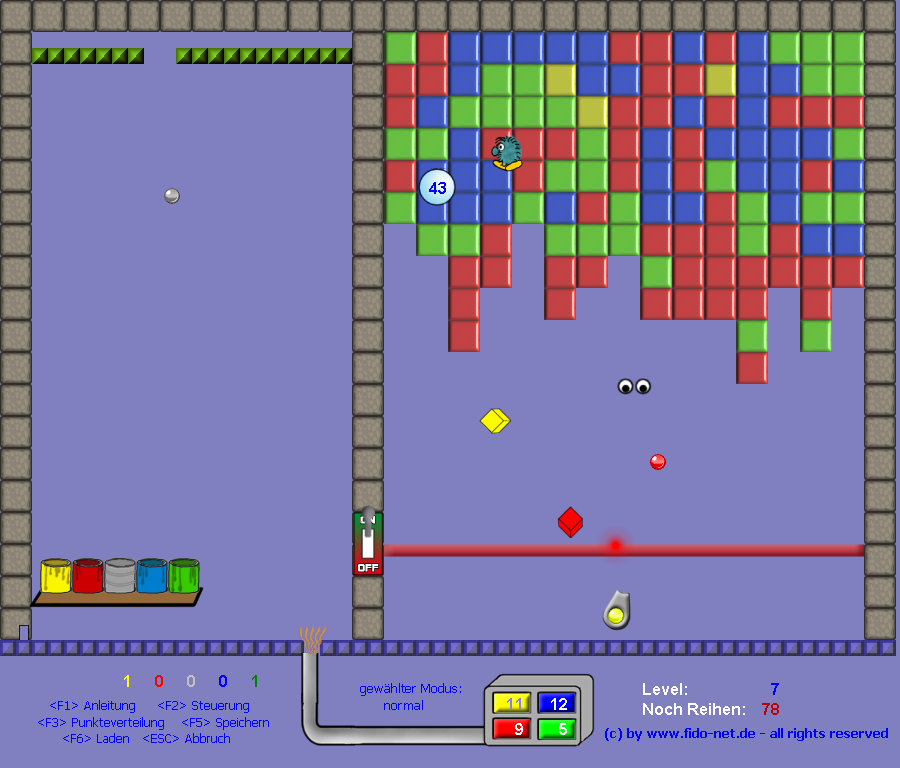 sind eigentlich ganz einfach:Von oben kommen Zeile für Zeile Blöcke herunter. Deine Aufgabe ist es, zu verhindern, daß diese Blöcke die rote Linie unten überschreiten. Du schiesst mit Kugeln auf die Blöcke, hierbei gilt:
