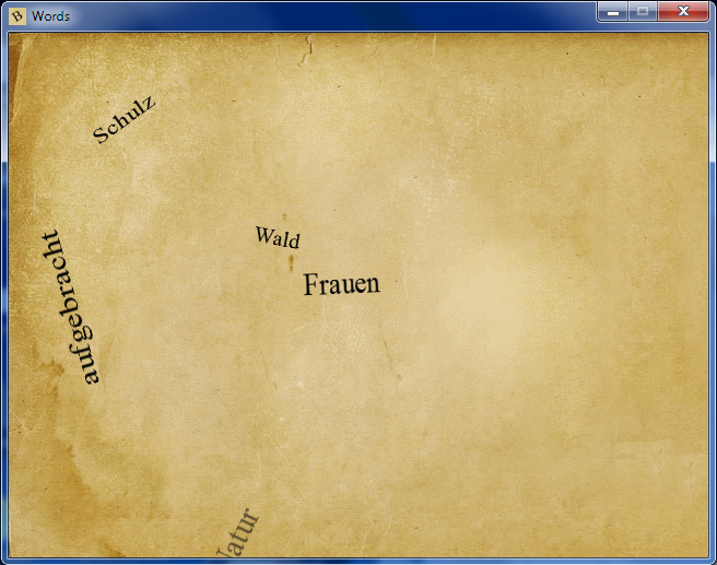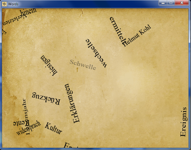 Bedienung: Es erscheinen nach und nach Wörter auf einem Blatt Papier. Diese wandern, biegen sich und rotieren.