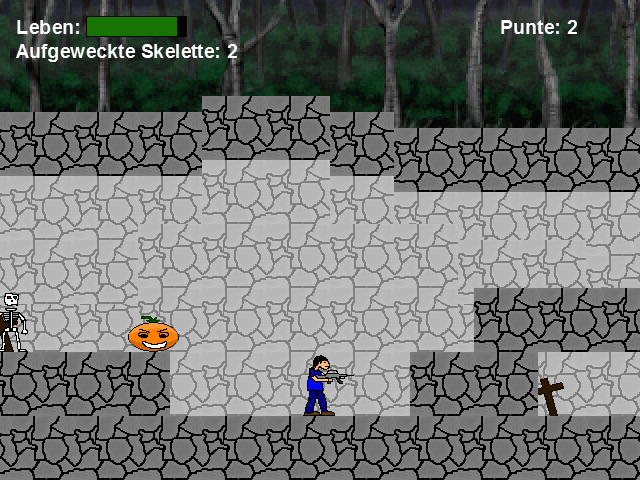 Es ist ein kleiner Platformer mit 16 Leveln, bei dem man verschiedene Feinde, die zu Halloween passen, killen und Tote aufwecken muss.