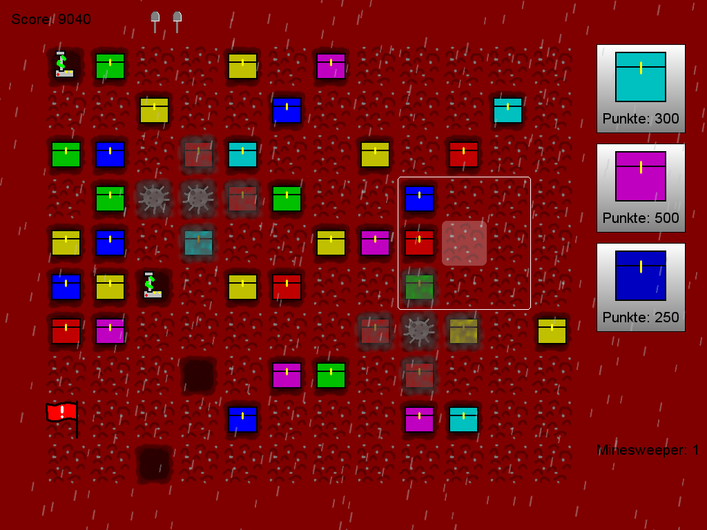 • Interessantes Konzept. Leider nicht ganz so durchdacht wie es sein sollte. Man kommt mit "Taktik" nicht wirklich viel weiter als durch simples Raten. (Oder meine Taktik war einfach nur mies) Hier hättest du dir etwas mehr Gedanken übers Balancing machen sollen. (z.B. weniger Strafe fürs Rechtsklicken) Ausserdem ist mir schon bei der zweiten Runde ein Fehler aufgekommen: Ich konnte nicht sterben. Ich hatte alle Leben verloren, konnte aber trotzdem noch weiterspielen bis alle Felder offengelegt waren. Die eher schlichte Präsentation und mangelnde Musik stören dagegen eher wenig. Hab mich jedoch zu Tode erschreckt, als mit voll aufgedrehten Kopfhörern die erste Mine hochgegangen ist! :D