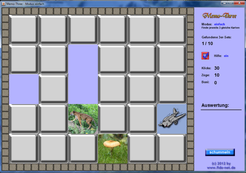 Klingt einfach? Ist es auch - sofern man im Modus "einfach" spielt. Hier braucht man immer nur jeweils 3 gleiche Karten umzudrehen. Dieser Modus ist aber nur für Anfänger gedacht.