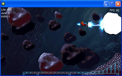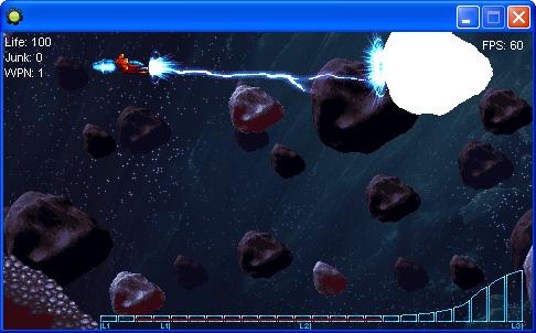 Die Version ist relativ simpel gehalten. Der Blitz ist in dem Fall genau so lange wie ein Spielbildschirm. Als erstes (das mußt du jeden step machen), rechne ich aus, wieviel platz nach vorne frei ist. Dann zeichne ich den Blitz mit der draw_sprite_part funktion bis zu dem vorher errechneten Punkt. Danach legen ich an dieses Position den Treffer Effekt. Auf den Bildern nicht zu sehen: wenn der Blitz verschwindet, werden auf der ganzen Fläche, die er am Ende belegt hat, noch blaue Partikel verteilt, eine art "Reststrahlung" wenn man so will.