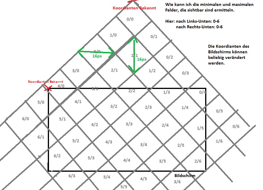 Meine Frage ist jetzt: Wie kann ich jeweils die minimale und maximale Koordinate berechnen, damit alle auf dem Bildschirm sichtbaren Felder gezichnet werden, aber alle anderen nicht.