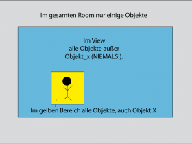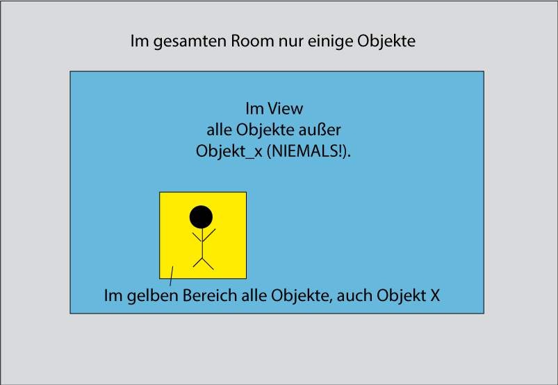 - Im View sollen alle Objekte AUßER Objekt_x aktiviert sein. Objekt_x darf NIE hier aktiviert sein (außer im gelben Bereich, dort soll es aktiviert sein), also auch nicht nur kurz wie z.B.: instance_activate_all() und dann instance_deactivate(Objekt_x), denn dann wäre das Objekt ja für einen ganz kleinen Moment aktiv und das darf nicht passieren!