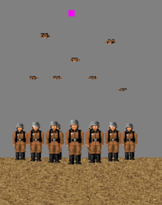 Im Anhang seht ihr in Frontansicht schön die originalen Instanzen mit dem Soldaten-Sprite, oben auf dem grauen Hintergrund dann die neuen Instanzen. Sie sind wie gesagt Instanzen des selben Objektes, der einzige Unterschied ist, dass ich sie später in den Level gepackt habe. Wenn ich einen komplett neuen Room anlege und dort nochmal alles verteile werden ebenfalls alle Instanzen so auf den Himmel gekritzelt.