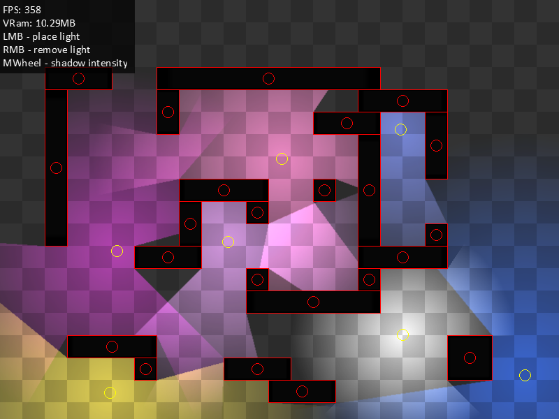 Es handelt sich hierbei um eine gewöhnliche Lichtengine, die mehrere farbige Lichter unterstützt sowie Strukturen, die Schatten werfen, sogenannte Caster. Hier mal ein kleiner Screenshot aus dem Example:
