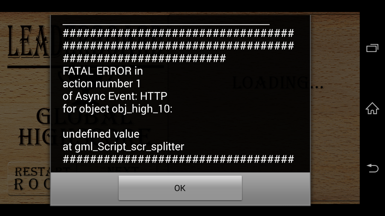 Funktioniert (eigentlich) ganz gut - aber es kommt immer wieder mal (nicht immer, und immer wieder in einem anderen Level) zu der Fehlermeldung die ich im Datenanhang per Screenshot erstellt habe.