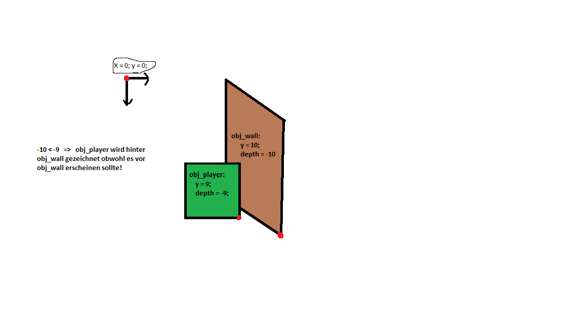Aber die Mauer wird nicht richtig gezeichnet, so wird sie vor dem Player gezeichnet wenn er in der linken unteren Ecke der Wall steht, obwohl sie eigentlich hinter ihm sein sollte.