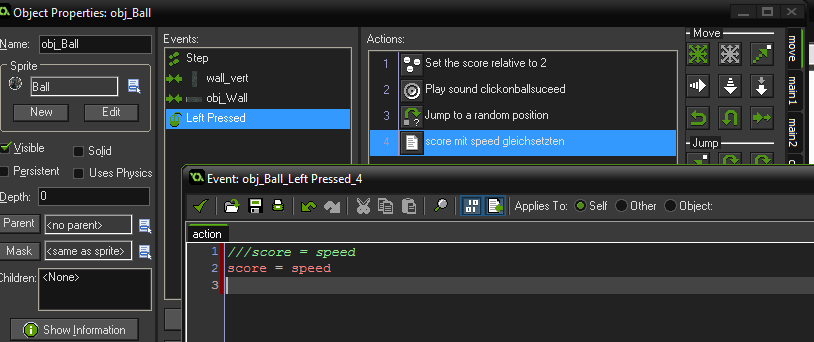Ich habe ein spiel bei dem man auf einen sich bewegenden ball klicken muss.Mit jedem Treffer bekommt man einen Punkt, bei jedem danebentreffer einen punkt minus. ich möchte jetzt per code sowas wie if score relative +1 >speed relative +1 if score relative -1 > speed relative -1. hier ist ein Ansatz von mir, aber der funktioniert noch nicht ganz, und das bewegen des Balls per code hab ich auch noch nicht verstanden...