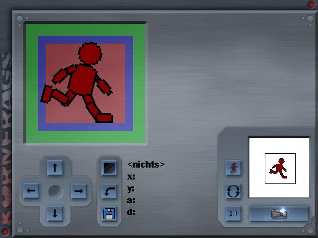 • Ich hab mir das Ding bereits gestern angesehen und muss vor allem loben, dass das Ding keine Interpolation vornimmt, was bei Pixelsprites vor allem am Rand stören würde. Die Bedienung ist zwar recht intuitiv, aber das ganze Design ist mir ein wenig düster und ein paar Pop-Up-Hilfetexte bei den Buttons wären schick. Vielleicht auch gleich ein kleines Malprogramm integrieren? Und natürlich eine Möglichkeit die Animationen gleich zusammenzufügen und in Bewegung zu sehen... Interessant sind natürlich die kfd-Dateien. Mit etwas Geschick kann man sich daraus Gegner basteln, die aus den Einzelteilen bestehen und nicht aus dem davon gerenderten Sprite. Vielleicht kann man ja auch noch Funktionen programmieren, die den einen Zustand in den anderen weich überführen. Dann kann man einem Gegner die Gliedmaßen einzeln abschießen oder so Späße. Ich werde mir das Programm mal genauer anschauen, wenn ich wieder einen Gegner für Space Rampage bau. Spontan hab ich da an eine Spinne gedacht, da macht die Animation der Beine vielleicht Sinn...