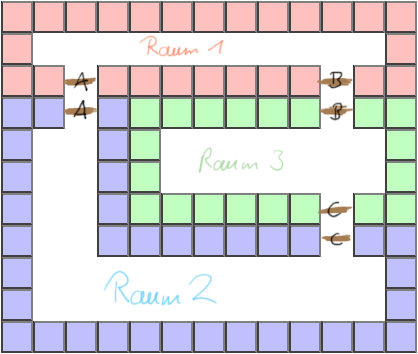 also wenn er durch tür A raum 1 betritt, soll er nicht bei tür B stehen.