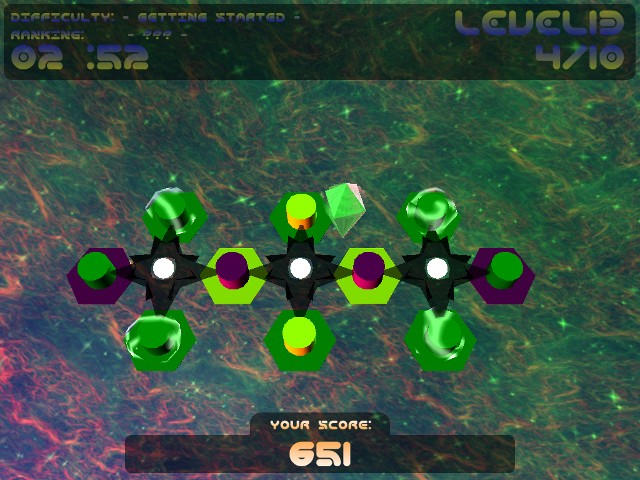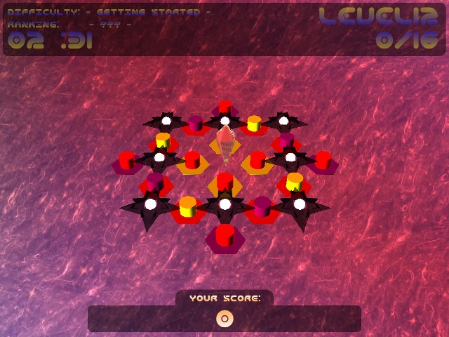 Bei diesem kniffligen Spiel gilt es, verschiedenfarbige Steine auf ihre gleichfarbigen Ziele zu befördern. Dazu dienen 4-armige Sterne, die pro Klick um 90° gedreht werden können. Insgesamt gibt es 66 Levels mit langsam steigendem Schwierigkeitsgrad. Ehrlich gesagt glaube ich nicht, dass es irgendjemand gibt, der tatsächlich alle löst, aber ich lasse mich gern vom Gegenteil überzeugen!
