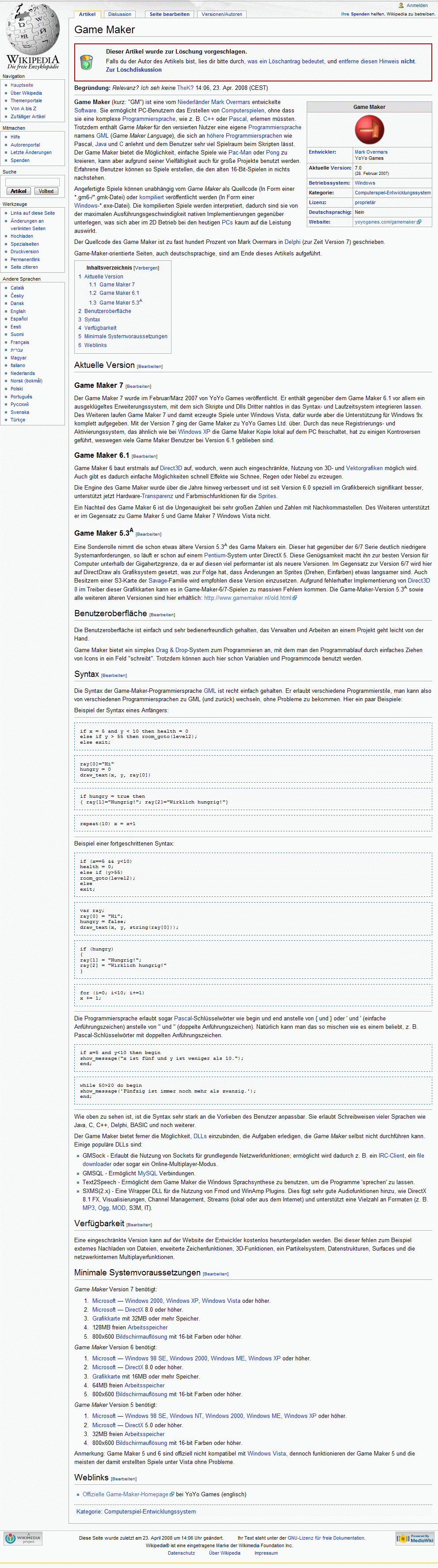 Da rühmt sich die Wikipedia Gemeinde immer für ihre Demokratie, aber gegen die Mehrheit wird ein Artikel mit der Begründung er sei nicht relevant und zu viel Werbung gelöscht. Da frage ich mich wirklich, wie relevant eine Information sein muss, damit sie als behaltenswert eingestuft wird. Offensichtlich wird der Kreis der potentiellen Game Maker Benutzer als zu klein angesehen.