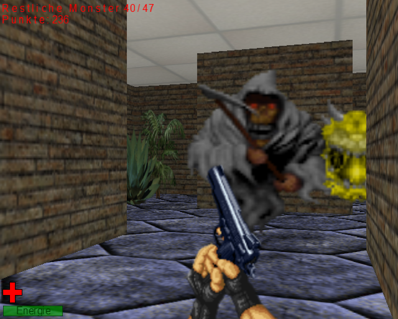 • D.Shooter ist ein "Pseudo 3D" First person shooter. (Ich sage Pseudo 3D, weil es im 3D Modus ist, aber keien 3D Objekte vorhanden sind)