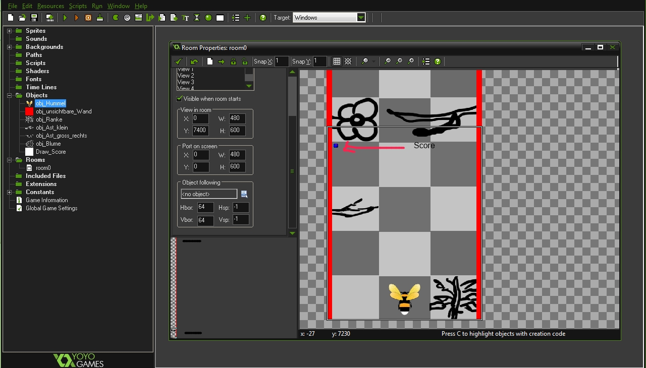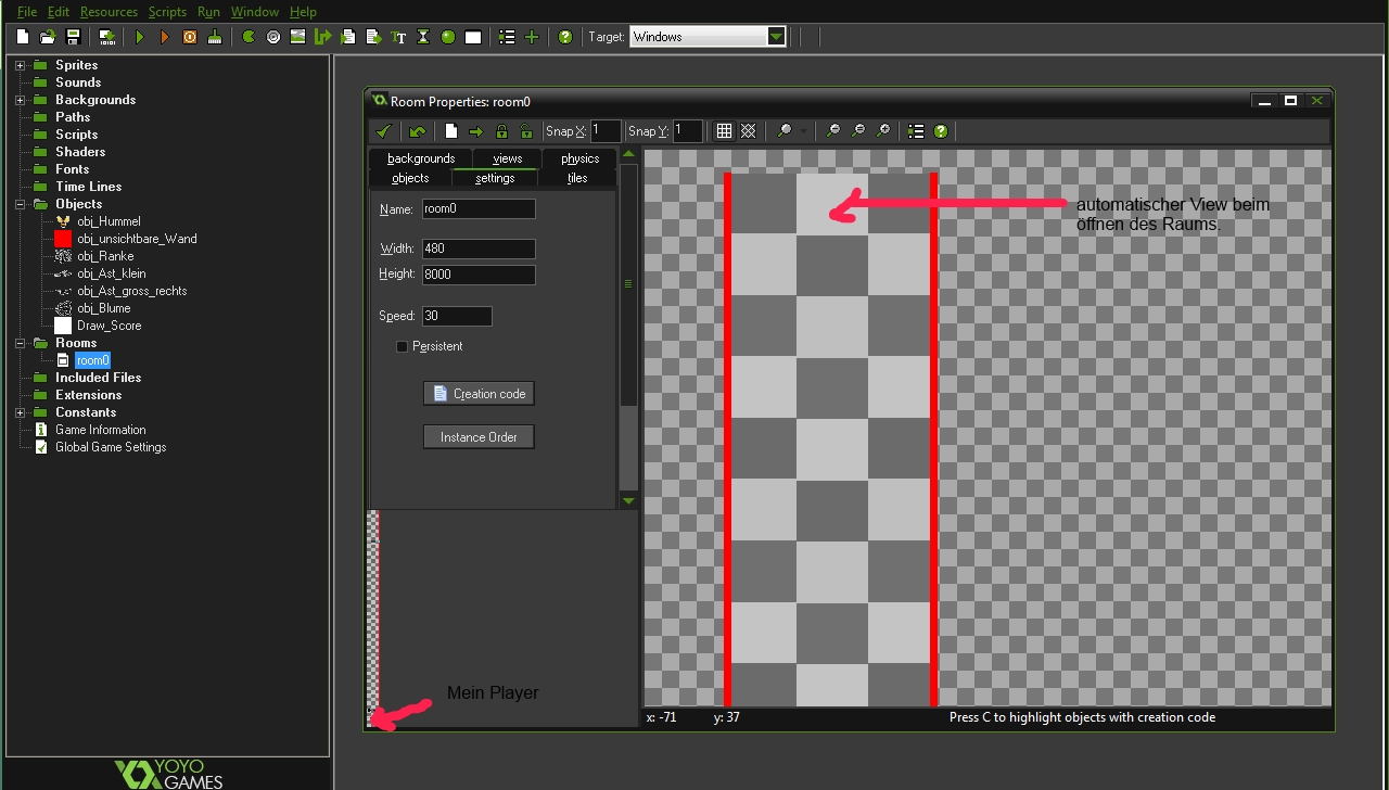 Anfangs war es so, dass ich den großen Raum hatte, bin dann jedes Mal wenn ich den Raum geöffnet habe von Position 0 (x=0, Y=0) auf meine y=8000 runter gescrolled, hab dort meinen view festgelegt (view room : x:7600, y:0) und dann mit scrolling background alles soweit hinbekommen, nur wenn ich mir jetzt im Bild den score anzeigen lassen will erscheint er nicht.
