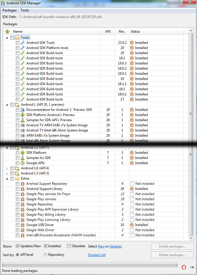 Installiere alle schon vom SDK Manager selbst ausgewählten Packages, alle Tools und die Android Versionen, die du unterstützen willst (am besten auch alle). Hierbei reicht es jediglich die SDK Platform und die Google APIs auszuwählen. Einige Versionen sind versteckt, hier musst du einfach "Obsolete" auswählen, danach sind auch diese sichtbar. Das ganze sollte dann etwa wie auf Bild 1 aussehen.