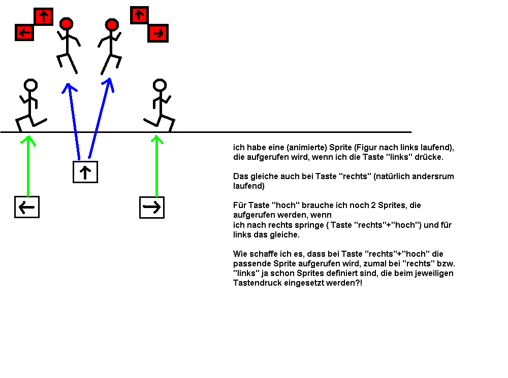 Da ich aber auch schon für die Taste "links" und "rechts" eigene Sprites definiert habe (also eine nach links guckende und eine nach rechts guckende), weiß ich nicht, wie ich für die Tastenkombination "links"+"hoch" und "rechts"+"hoch" eine eigene Sprite einsetzen kann.